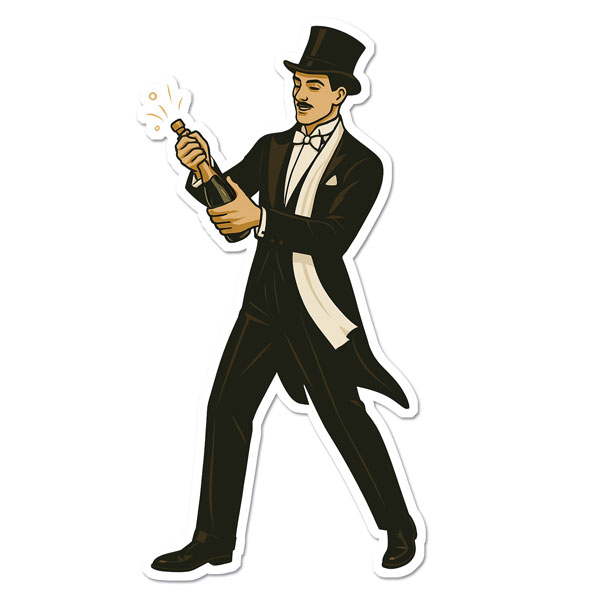 Detta festliga klistermärke visar en stilfull gentleman i frack som öppnar en champagneflaska – perfekt för att sätta rätt stämning på allt från laptop och resväska till barvagn och partydekorationer. Den eleganta retrostilen ger en lyxig 1920-talskänsla, och premiumvinyl gör att klistermärket håller både färg och form länge, oavsett var du fäster det. Skapa omedelbart festvibbar med en tidlös touch av glamour!