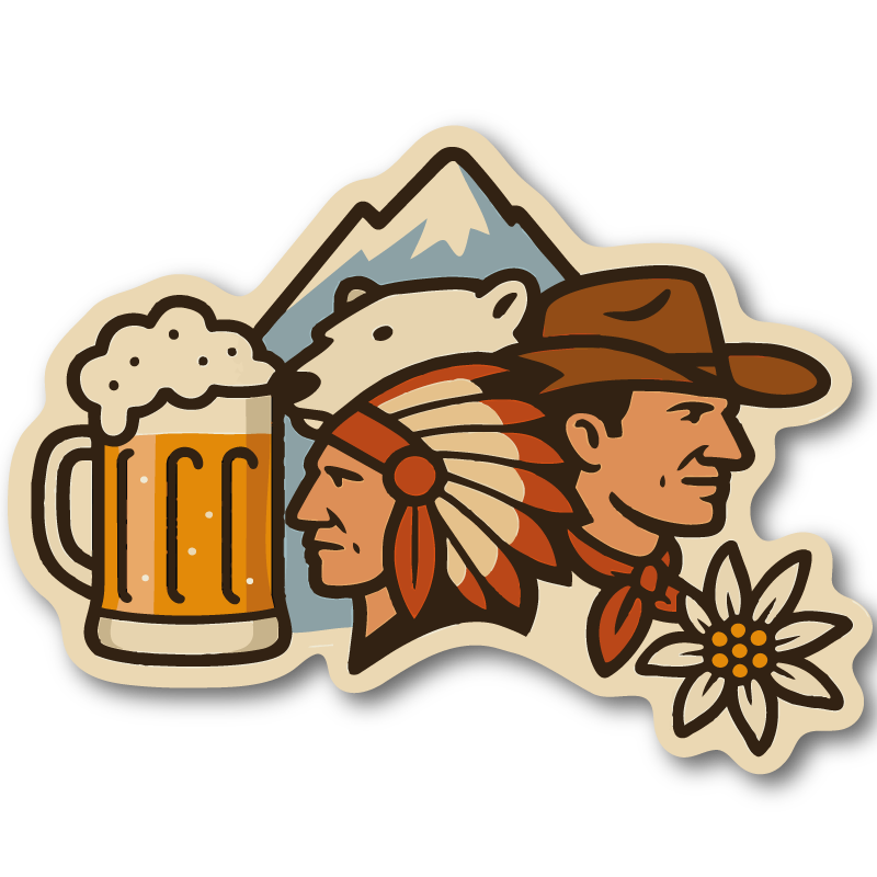 En lekfull retrodesign där vilda västern möter alpkänsla. Motivet visar två klassiska profiler rygg mot rygg – cowboyhatt, fjäderprydd huvudbonad, ölsejdel och bergslandskap med edelweiss som detalj. Perfekt för dig som gillar humor, après-ski-vibbar och vintage-illustrationer med tydliga linjer och varma färger.