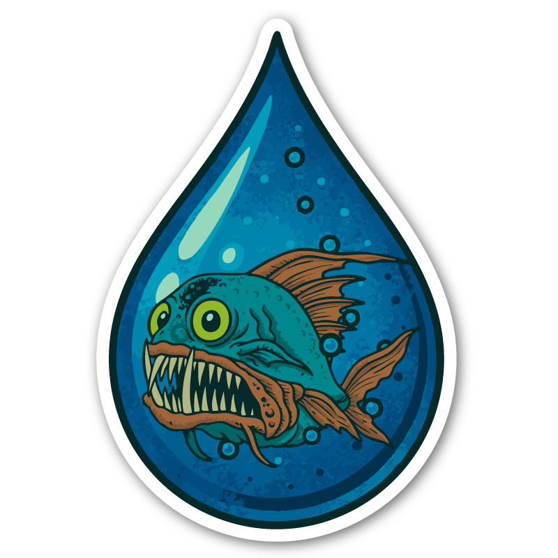 Ge dina saker en rejäl dos undervattensattityd! Det här klistermärket föreställer en galet uttrycksfull djuphavsfisk instängd i en vattendroppe – perfekt för dig som gillar humor, edge och unika illustrationer.