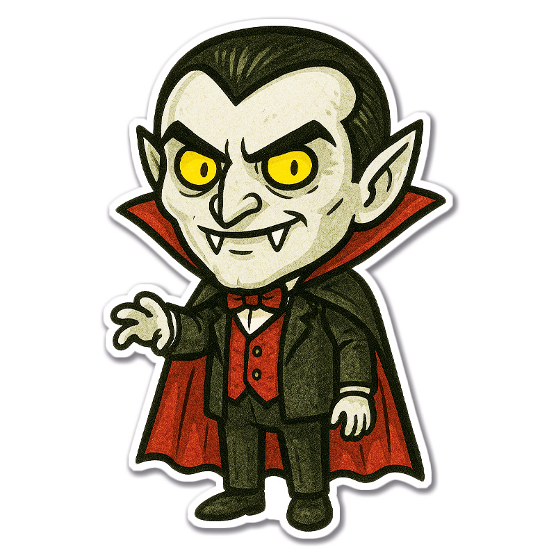 Klistermärke med Dracula. Klistermärket har en vit kant runt.