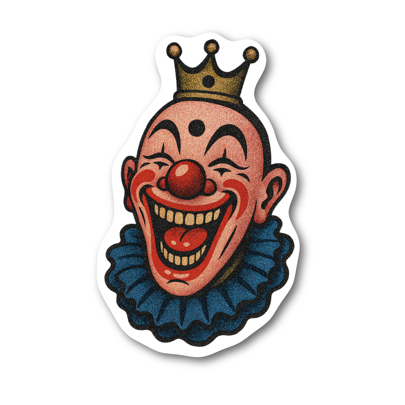 Ett klassiskt skrattande clownansikte med bredt leende, krona och krage – färgstarkt, lekfullt och med en lätt mörk underton. Illustrationens vintagekänsla och tydliga konturer ger ett uttryck som drar blickarna till sig direkt.
