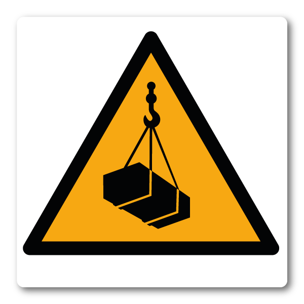 Ett tydligt varningsklistermärke som uppmärksammar risk för hängande eller lyft last. Lämpligt för byggarbetsplatser, industrier, lager, verkstäder och andra miljöer där lyft med kran, travers eller lyftredskap förekommer. Symbolen ger en snabb och tydlig varning för fallande föremål.